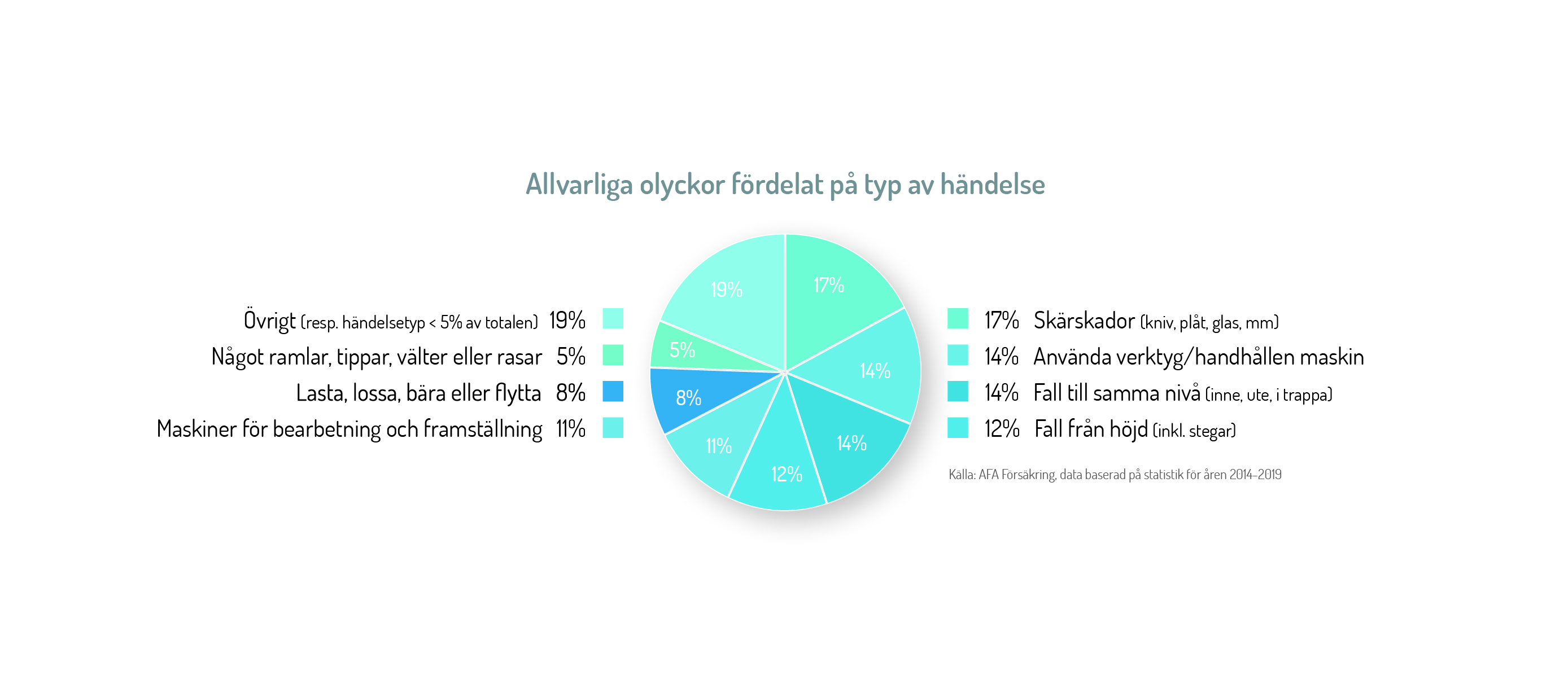 Den vanligaste orsaken till allvarliga olyckor är fall, eller att personen ramlar, och därefter kommer olyckor med verktyg och maskiner och skärskador av olika slag. Över en tredjedel av de allvarliga olyckorna leder till medicinsk invaliditet. Unga i åldrarna 16-25 år skadar sig oftare på maskiner och verktyg medan äldre, i åldrarna 56-64 år, oftare skadas av fallolyckor.