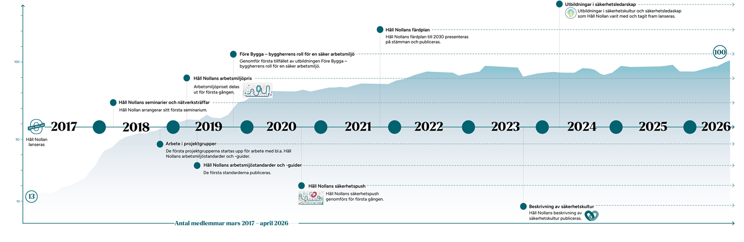 Det var när grundarna enades om att det behövdes en gemensam satsning för att åstadkomma en branschgemensam god arbetsmiljö som Samverkan för Noll olyckor i byggbranschen kom till, det som blev föreningen Håll Nollan. I april 2026 kunde vi berätta att föreningen nått en viktig milstolpe, den 100 medlemmen hade anslutit sig. Se samtliga medlemmar här.